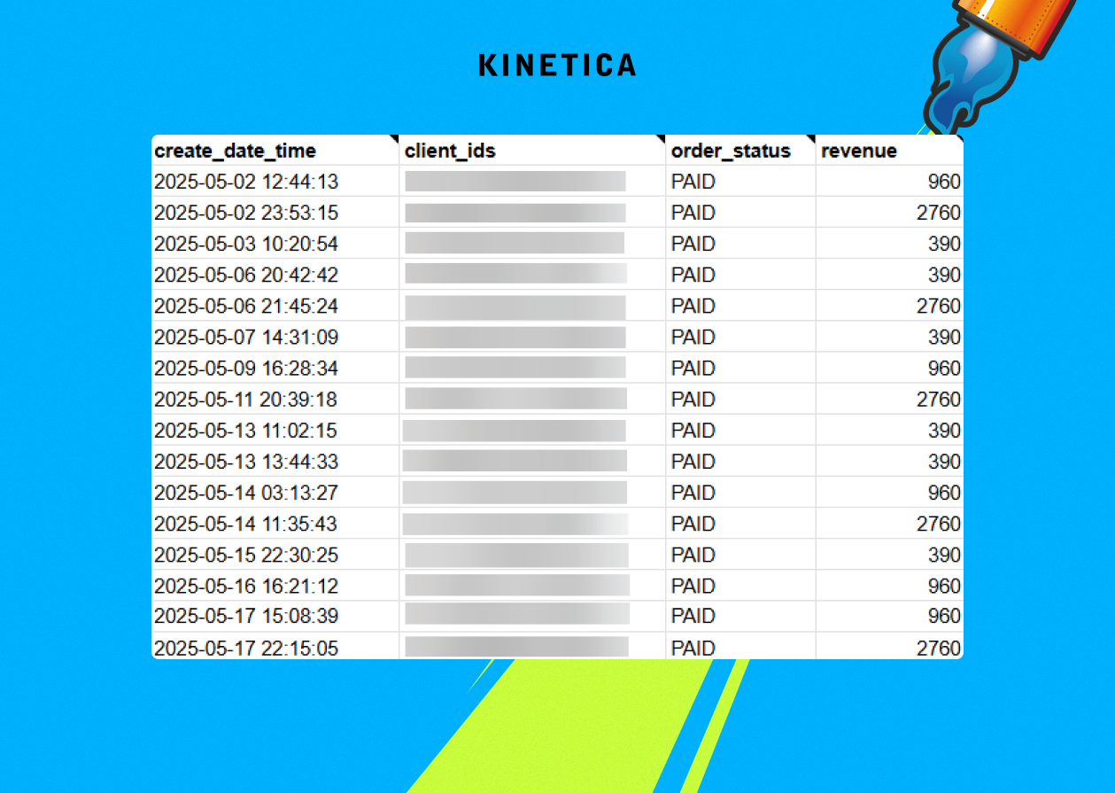 Механизм: при регистрации пользователя мы забирали его ClientID из Метрики и сохраняли в нашу базу. Когда этот пользователь совершал оплату, мы возвращали в Метрику данные: ClientID, сумму и дату. Яндекс.Метрика «склеивала» визит с оплатой. Можно вставить таблицу из которой передавали данные