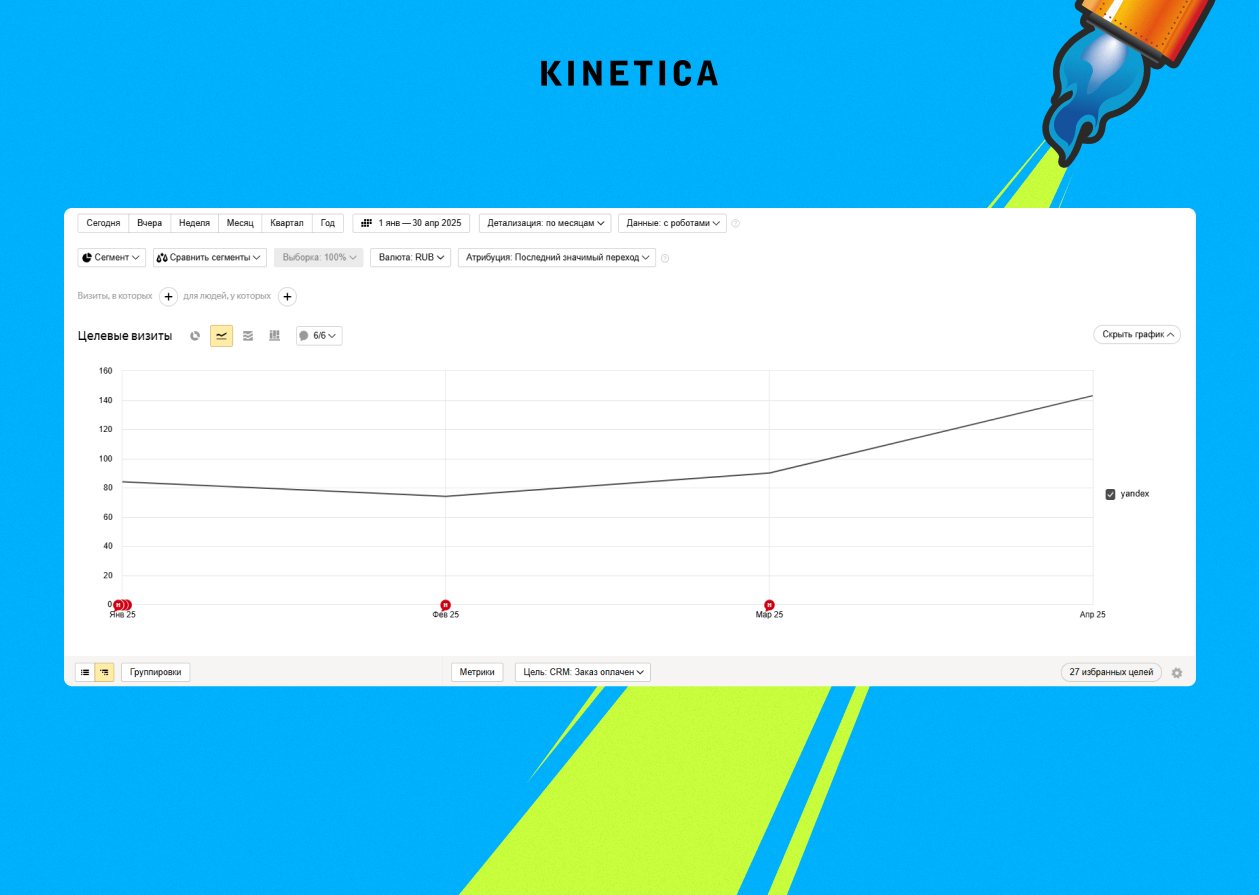 Конверсия из регистрации в оплату выросла с 20% до 24%. Простое изменение на сайте, подсказанное данными из Яндекс Метрики, сразу дало эффект.