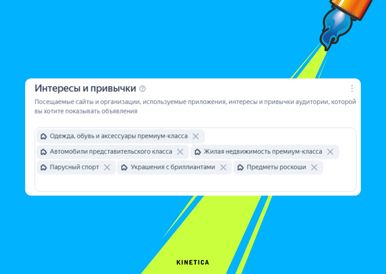 - РСЯ — для ценителей роскоши: здесь мы и решили проверить наш инсайт. Мы создали кампании, таргетированные не на лодки и катера, а на интересы: «автомобили представительского класса», «Жилая недвижимость премиум-класса», «Парусный спорт», «Украшения с бриллиантами», «Предметы роскоши».