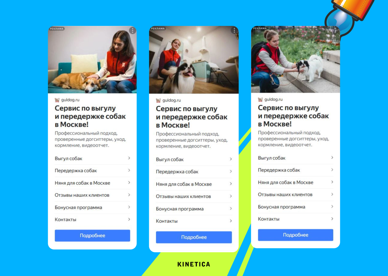 - Создали «человечные» креативы: реальные фото сотрудников и акцент на бесплатных бонусах (фотоотчет, мытье лап) сработали — доверие к сервису выросло.