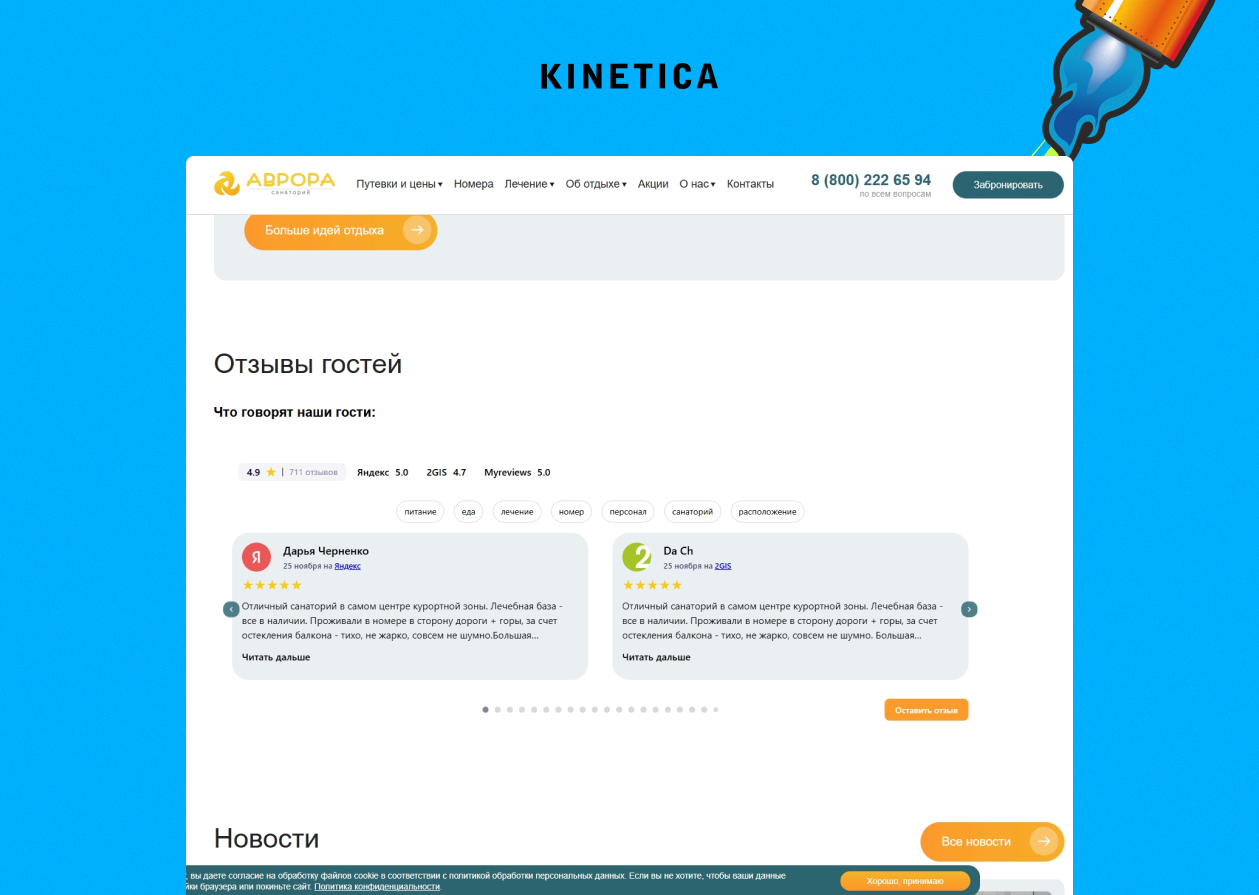 Наш инсайт: в мире здоровья и отдыха «живое» подтверждение качества важнее любой красивой картинки. Люди хотят видеть реальные отзывы и реальный рейтинг, а не статичные блоки «Нам доверяют».