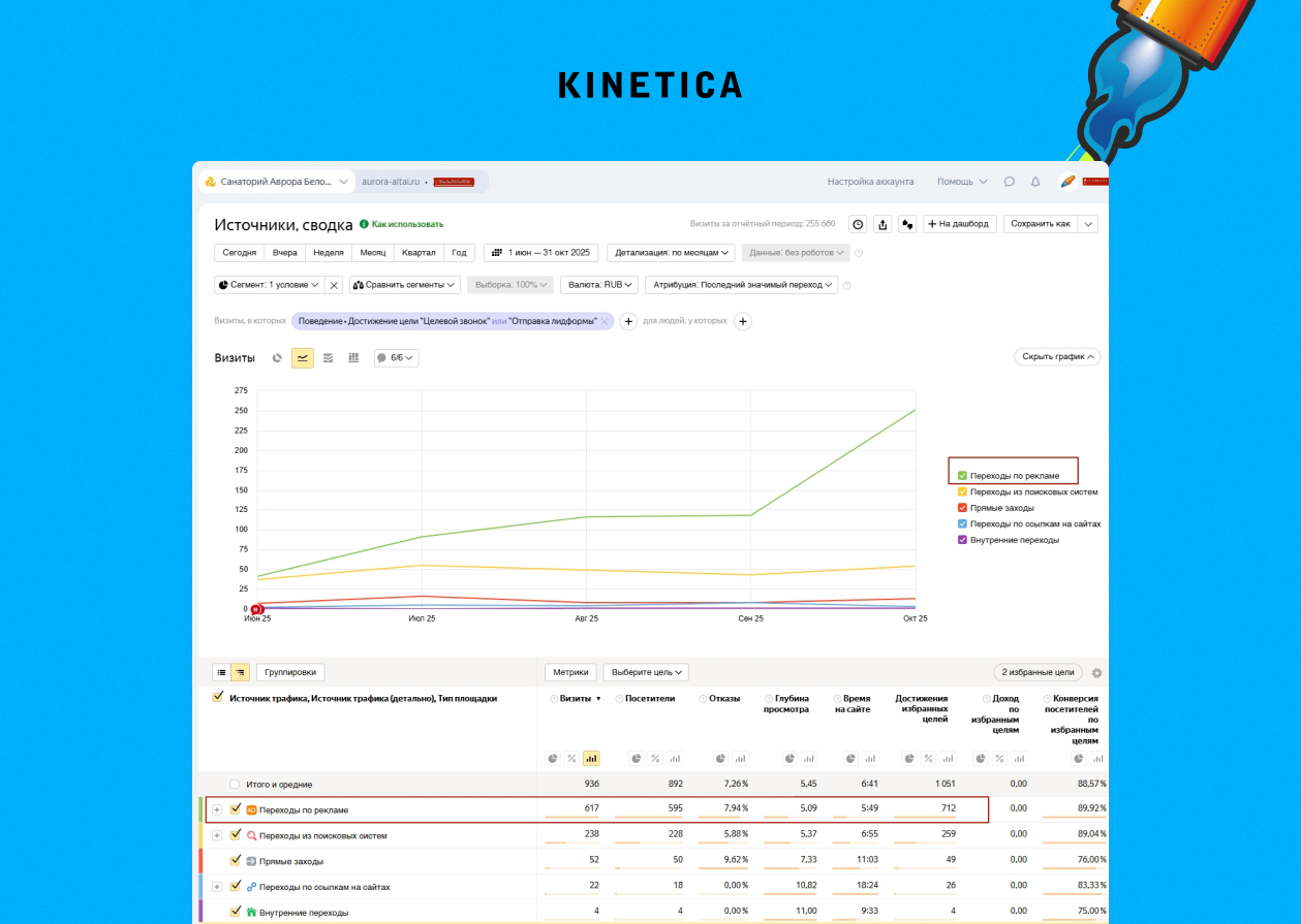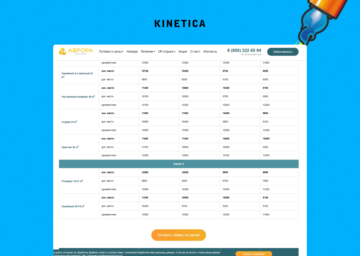 К нам пришел современный санаторий «Аврора». Сайт был красивый, трафик стабильный. Но была одна проблема: сайт работал как библиотека, а не как отдел продаж. Люди зачитывались статьями о лечении, но уходили бронировать к конкурентам. Конверсия в 0.24% была тому печальным подтверждением.