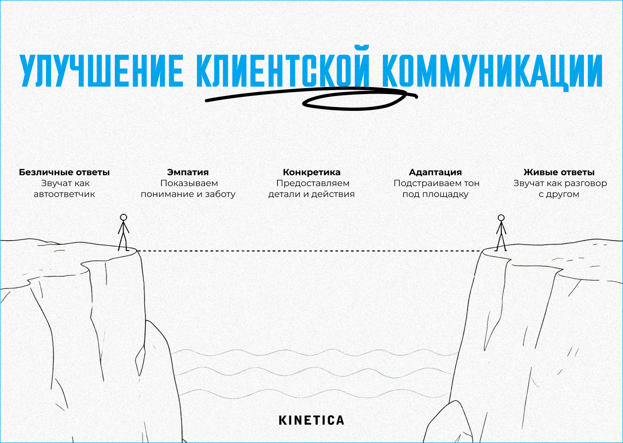 Мы избегаем канцелярских формулировок и шаблонов. Общаемся с клиентами так, как общались бы при личной встрече. Но перейти от сухих и обезличенных ответов к живой коммуникации — это путь. Он требует практики, эмпатии и внимания к деталям. Вот из чего он состоит: