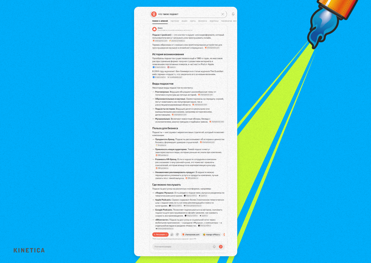 У Яндекса с 2024 года работал «Поиск с Нейро», а теперь — это прокачанная версия под неймингом Алиса: структурированные, мультимедийные ответы, возможность задать уточняющий вопрос — и всё это в рамках одной экосистемы.
